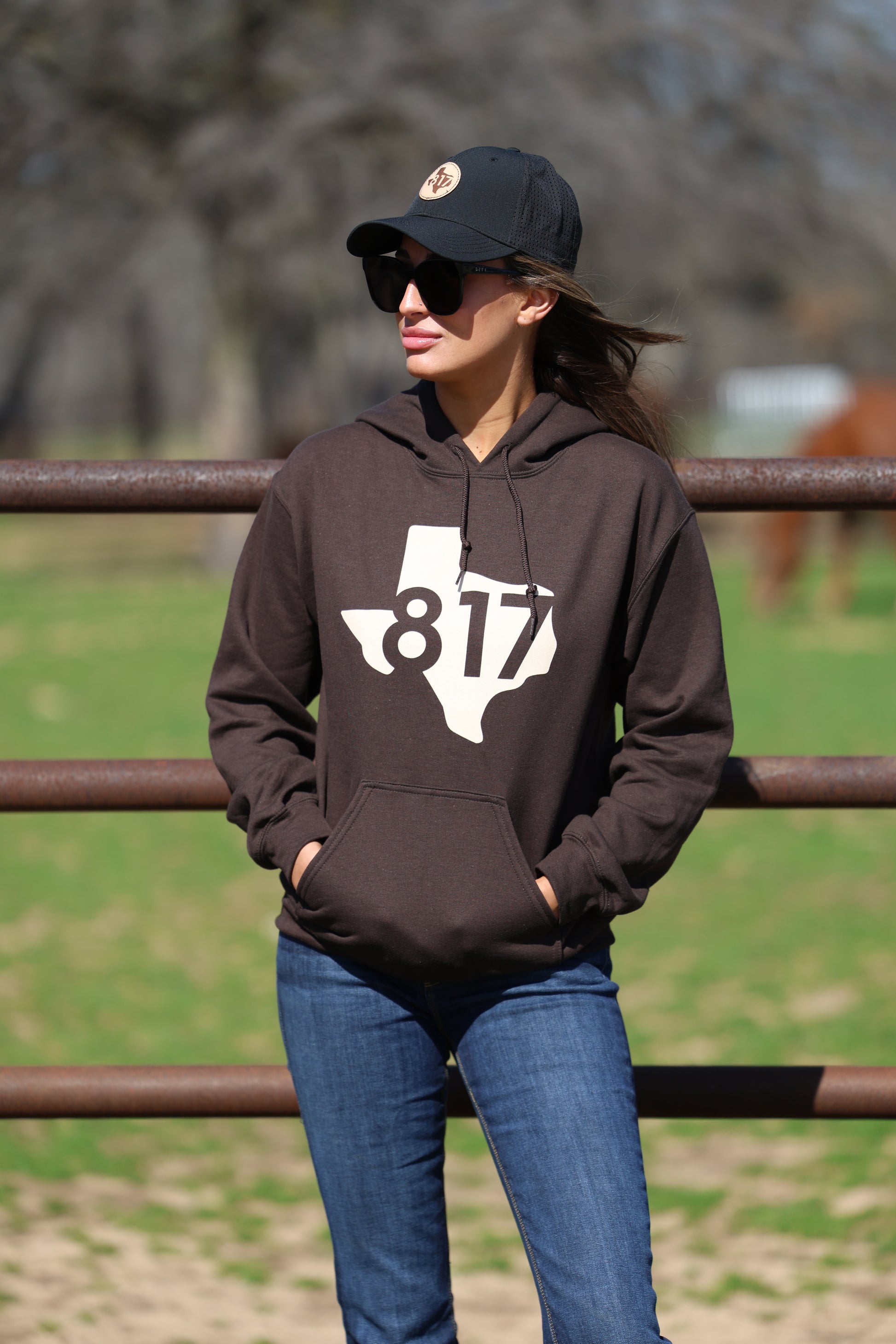 Unisex Chocolate Hoodie with 817 Horse Sales Texas Logo